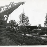 8 of 8 of a series of photographs showing unloading logs from a logging truck at Gales Peak Lumbermill. This picture shows two men standing on a log in the millpond. They have just unhooked the grappling hook while a third man steadies the log with a pole. A fourth man is standing by. The boom is off to the left in the picture. In the background is a 1953 or 1954 Ford pickup. This boom, produced by Wallace Dozers in Forest Grove, became the “Heel Boom” known throughout the Northwest for its advantages over older style booms in loading and unloading logging trucks.