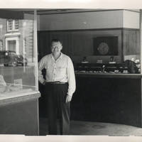 William Skinner is standing in the entrance-way of Mayhew Jewelry store William Skinner is standing in the entrance-way of Mayhew Jewelry store on the corner of Mains Street and 21st Avenue. He is wearing a long sleeved button shirt with two breast pockets with pocket flaps and dark trousers. Merchandise can be seen in the two display windows and the reflection of an early 1930s two-door sedan that is parked across the street in front of the Masonic Hall. A clock in the store is at 1:28.