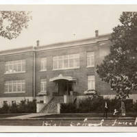 This brick three story building facing Elm Street was the first dedicated High School building and it was called South Park High School. There is a sidewalk in front and it appears to be concrete. There is also a flagpole out by the street. The street appears to be packed dirt. The main entrance is in the middle of the front of the building. There are flower boxes in the two windows on each side of the main entrance. A man and a woman with a baby stroller are on the sidewalk. The building was sold to the Catholic Church and was being converted when it was destroyed by fire in 1956. The gymnasium, across Elm Street, was torn down in the mid 1980's.