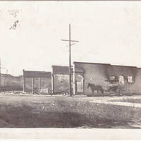 2 of 4 pictures taken the day after the July 20, 1919 fire in downtown Forest Grove. This picture was taken from the Pacific University campus looking across College Way toward 21st Avenue. This picture is closer to the corner of College Way and 21st Avenue showing the entire block of businesses on 21st Avenue that are destroyed. All that remains are some brick walls. The street looks to be paved with a curb and a wood sidewalk on the university property. The large oak tree on the church corner is badly singed. On the right of the picture is the wall of the Public Library that still stands today. There is a public drinking fountain at the curb in front of the library entrance. There is a horse and buggy on College Way at the corner of 21st Avenue going South. Businesses destroyed by the fire are, Archibald Bryant’s Photo Gallery, Bryant’s Musical Instruments, Belle Darling’s Photo Gallery, O. M. Sanford’s second hand store and team of horses, Staehrl’s three story residence, Public Library, Washington Co. Poultry Association’s warehouse, A. B. Thomas three story residence, Palace Garage, C. H. Adams Millinery shop, Odd Fellows building, Allen & Co. Hardware in the Odd Fellows building, Leabo Livery Stable, vacant building of marble and granite works, unoccupied building and the Congregational Church. The Copeland & McCready Lumber Yards were on fire many times but saved and the Caples Building plate glass front was destroyed by the heat.