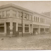 Picture looks to have been taken from the northeast corner of Pacific Avenue and Main Street. The building on the corner is a two story concrete building. There is a doorway at the corner and set back some and a 45 degree angle through the corner of the building. There is a square post in front of the door making an entrance from each street. There is a plaque on each side of this post and a sign in each window adjacent to the door FOREST GROVE NATIONAL BANK. On the second floor corner windows there are signs DR. POLLOCK DENTIST. Two more signs on second floor window are not legible. Adjacent to this building is another two story building with three storefronts and then a three story building. There is a post on the sidewalk between these two buildings with a large round clock at the top. There are two small groups of people in front of the bank and a man walking West by the first storefront past the bank. The sidewalk looks to be concrete and the streets are packed dirt.