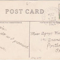 [front] 5165 Laughlin’s Hotel, Forest Grove, Ore. [back] Miss Agnes Mitchell 191 Grand Ave. N. Portland Ore. Postmarked Forest Grove Mar 27 1909 with a one cent stamp. Aggie:- I will do as I promised Alma.