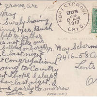 [front] No 22 M. E. Church Forest Grove Ore [back] Mr. Ray Schermerhorn 9416 – 58 Ave Lents Oregon Postmarked Forest Grove Jun 28 1917 with a one cent stamp. Forest Grove, Ore Dear Ray I am surely having a fine time Mrs. Bush and I slept to-gather My bed is not like our to home builded on horse(?) Eat at M.E last night to-night at Congregational I am going to Country to night I hope I sleep more then last night. I be home early tomorrow night Lula
