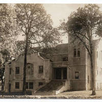 A two story church with a lower floor that is a partial basement. Steps lead up to the front doors located on the right one-third with the bell tower to the right of the entry. The left two-thirds have a double scalloped gable that make most of the remaining main floor. A large three panel stained glass window is in the center of this gable. The roof above the next floor runs lengthwise and has similar double scalloped gables on both ends. Most of the top of the bell tower is behind tree branches and can’t be seen very well. There are four trees in the front and a few on the left of the building. The back half of a house can be seen on the right of the church in the background. The sidewalk could be wood or concrete. This church was built in 1912 and was on the northeast corner of 18th Avenue and Birch Street. The church name was changed to Forest Grove Methodist Church in 1940. The building has been replaced with a newer building.