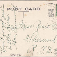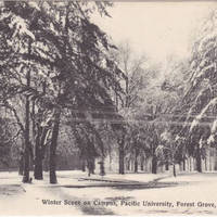 [front] Winter Scene on Campus, Pacific University - Forest Grove, Oregon. [back] Miss Rosie Shackla Sherwood Ore. R. F. D. #1 Postmarked McMinnville Sep 23 1909 with a sideways one cent stamp. McMinnville Sept 22/09 Hello Rose “Don’t forget me” Little girls (?) Rummal