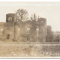 The first Congregational Church was destroyed by fire in 1901. The second church was destroyed by fire in 1919. This brick building was built in 1920 and is the third in a series of Congregational Churches on this property along 21st Avenue between Main Street and College Way. The front is an unusual quarter-round with entrances close to each end, one on College Way and one on 21st Avenue. Each entrance is in a tower that appears to be one story above the roofline of the building. The building is two stories high with a partial basement. There is a sign our front but not readable This picture was taken from the Pacific University campus. The street appears to be paved with a curb but there is no sign of a sidewalk. There is concrete steps and walkway from the street to the entry steps. On the right, in the background, are a couple of 1920’s cars on Main Street and two storefronts can be seen. The one on the left has a sign towards the top of the two story building DRUGS.