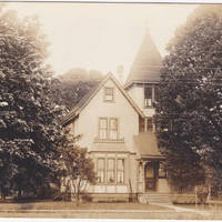 The home is in the Queen Anne Victorian style. This house, facing Elm Street, is somewhat narrow in the front but with a large gable on the left facing the front and a third story tower on the right it looks large. There is a roofed window bay on the first floor below the gable. The porch starts at the end of the gable and looks to go around to the right side of the house. The porch has its own roof. There is a small outbuilding on the right. It looks like screens are place on the ground beside windows as if they were being installed or taken down. The sidewalk is wood. The street is not visible in the picture but there is a tall possibly concrete curb. Grass and weeds are growing in front of the curb indicating the street is dirt.