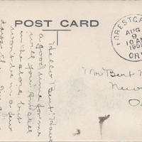 [back] “Postcard”; postmarked “Forest Grove, Oregon, August 9, 1909,” cancelled green one-cent postage stamp. Addressed to “Mr. Bert Nixon, Newport, Oregon.” Text: “Hello Bert! Have a good time for me will you? Am still in the store. But won’t be in a few days. Then I’m going to have another vacation See: Reba is back this morning. Went way out in the woods yesterday had a big time.” Signed “Clara B.