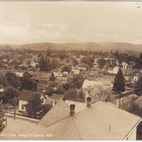 Picture taken from the water tower located on the west side of A Street between Pacific Avenue and 21st Avenue. View is looking south-southeast. The large roof in the lower front is the Loughlin House (hotel) on the corner of A Street and Pacific Avenue, facing A Street. The large roof on the far right is the Forest Grove Hotel on Pacific Avenue. A Street is going south.