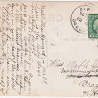 [front] No 9 Residence Section Forest Grove, Ore. [back] Miss Mable Howard McMinnville (Dayton is crossed out) Oregon c/o Hospital Postmarked Albany Ore. Oct 12 with a one cent stamp. Dear Miss Howard; - Well how is the lady these beautiful days. I’ve been back in Eugene for a few weeks, but I am rambling just now – making a little hurried business trip down in your part of the world. Expect to be in your own little city, Dayton most of the day Thursday of this week arriving on the 9:19 car from Portland. Hope we will get to say hello at least. As ever C. F.