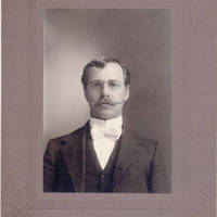 Portrait of Mark Bailey Bump, in his twenties, in a dark suit, with white bow tie. Bump has handlebar mustache, wears wire rim glasses, short hair, with curl at forehead. Mark Bailey Bump (1872-1951), Hillsboro lawyer, and brother of Forest Grove resident Daniel Bump.
