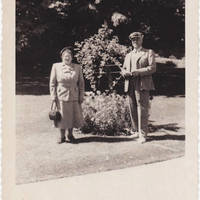 F. E. (Fred) and Fay Voget standing in front of an outdoor floral display. Fay is wearing a smart looking ladies suit with a hat and purse. Fred is wearing a suit and a jaunty cap. Mr. Voget was owner of Gales Peak Lumber Company during this time.