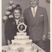 F. E. (Fred) and Fay Voget standing behind a wedding cake. Fred is wearing a double breasted suit with a white shirt and tie. Fay is wearing a dark ladies suit and hat. Mr. Voget was owner of Gales Peak Lumber Company during this time.