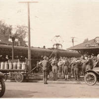 A Band playing musical instruments outside the Southern Pacific train station in Forest Grove. The band members are dressed in World War 1 style uniforms, complete with campaign hats. The train station is on the corner of 19th Avenue and Main Street. This is the east end of the train station that faces Main street. A Red Line electric train is in the background, behind the band and train station. On the street there are two automobiles and a wagon loaded with milk cans. The street is paved with a curb and a sidewalk is also visible.