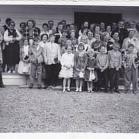 A group of about 50 people assembled on a porch all smiling for the camera. They are dresses as if they had attended or are about to attend church.