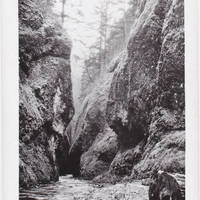 3 of 10 of a Columbia River Highway collection. View looking into Oneonta Gorge. Steep, almost vertical rock walls on both sides of a small stream flowing toward the camera.