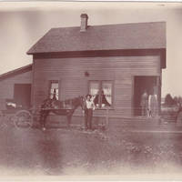 This simple box gable roof house was built by the Fairchild sons for their parents. The house was built around 1905 and is still located on the southwest corner of S. Alpine Street and 10th Avenue. This is a side view of the house. A bearded man and another man are standing on the porch with what looks like a Border Collie. The bearded man is wearing a dark shirt and lighter pants with suspenders. The other man is wearing a white shirt and bib overalls. A woman stands in the front yard and is wearing a dark blouse and lighter shirt. Another man with a horse and buggy are in front of the house. He is wearing a white shirt and dark pants. All the men are wearing hats and all are looking at the photographer except for the man on the porch who is looking at the dog. There is a leanto attached to the back of the house. A wire fence starts at about the middle of the side of the house and extends out of the picture toward the front yard.