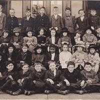 An outdoor picture of a group of children. All are dressed in their finest clothing and some of the girls are wearing hats. The building just behind them looks to be made of concrete.