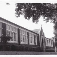 A somewhat dramatic and well composed picture of the front of Central School in Forest Grove. The building is made of brick and concrete. There is a flag pole in front of the building.