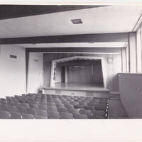 Picture taken of the interior of the high school theater. Many rows of seats on a floor sloping down to the stage.