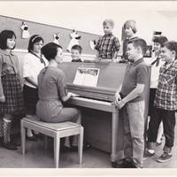 Picture taken in a Music Room. A woman teacher is sitting at a piano with young grade school students positioned around the piano. This looks to be a posed picture.