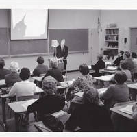 Men and women sitting in what look like student desks in a classroom for a presentation. The people are dressed in business casual. A man is standing at the front o the group manning an overhead projector. Chalk boards are on the wall behind the person at the projector.