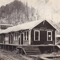 Office buildings of the Gales Creek Logging Company. Two sets of railroad tracks pass in front of the two buildings. Another set of tracks go behind the office and into the back. There are three smaller buildings on the right side of the picture