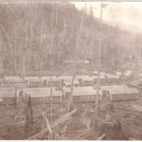 The back side of the office buildings of the Gales Creek Logging Company are on the right. Many smaller buildings are lined up in rows. Most of these would be living quarters for the workers.
