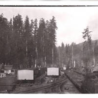A logging camp in the woods. In the middle of the picture there is a group of portable buildings sitting on tracks that can be transported by rail. To the left is a row of three houses that look to be more permanently established. On the right is a Shay steam engine with a number “5” on the back of the tender. This camp is in a heavily wooded area.