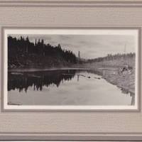 Picture looks to be at the end of a lake or a small body of standing water. The area around the lake to the shoreline has been cut of standing trees. In the background are standing trees of a heavily wooded area.