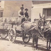 A wagon loaded with bales of hay and hitched to a two-horse team is standing in the street in town with storefronts behind the horses and wagon. Two men are sitting on the hay bales with one man holding the reins. All are looking at the photographer. The store behind the wagon looks to be a millinery store. The street could be packed dirt or pavement. There is a concrete curb but no sidewalk.