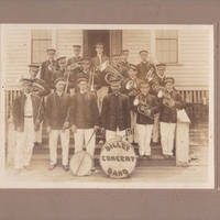 Seventeen young men in band uniforms pose on front porch steps with their musical instruments. The bass drum has Dilley Concert Band printed on the front.