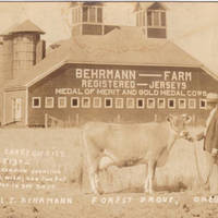 A man holding a rope attached to a cow is positioned in front of the broad side of a barn. On the side of the barn has in large letters is written BEHRMANN – FARM, Registered – Jerseys, Medal of Merit and Gold Medal Cows. The barn is quite fancy with two large cupolas and three silos alongside.