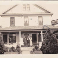 Two couples are standing on the front porch of an apartment house. Sign on the front of the building reads Furnished Apts and Single Rooms Reasonable Rates The building looks like a large house but with two front doors.