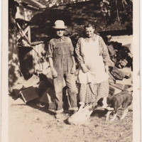 Henry and Alma Harms are standing together outside in front of a pile of firewood. Henry is wearing a long sleeved shirt, bib overalls and a hat. Alma is wearing a long polka dot dress with raised polka dots and a white pinafore over the dress. Two dogs are playing at Alma’s feet and she is watching them. Henry is looking at the photographer.