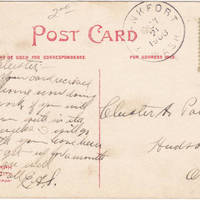 [front] Marsh Hall, Pacific University, Forest Grove, Ore. [back] Postmark Frankfort WASH Oct 21, 1908 with a cancelled one cent stamp [black ink] Cluster A. Parcher, Hudson, Oregon Cluster – Your card received I am home doing some work if you will come down with me the next 3 weeks I will go back with you have been trying to get up for a month All are well Love all EAS
