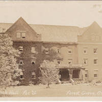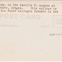 [front] Herrick Hall Pac U Forest Grove, Ore. 15 [back] [typewritten label] Girls Dorm, on the Pacific U. campus at Forest Grove, Oregon. This college is one of the first colleges founded in Ore