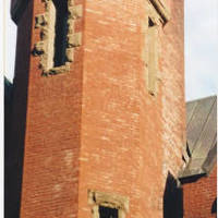 Picture of the exterior of Marsh Hall on Pacific University Campus, Forest Grove, Oregon. Picture is of a close up of the tower at the front of the building.