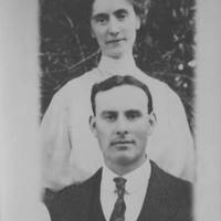 Head and shoulders picture of Frank S. Gordon with his wife, Matie Hunter Gordon standing behind him. Frank is wearing a suit, white shirt and tie. Matie is wearing a high- collared white blouse