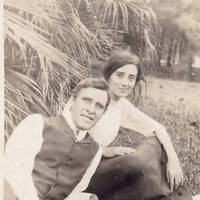 Photograph of man and woman, man lying on grass, woman next to him, sitting. Man wears black vest. Both figures are smiling. Palm leaves in background. William James Fadden (1873-1958) and wife Nancy E. Glenn Fadden (1894-b.1930). William’s mother was Priscilla Jane Patton Fadden (1852-1923), the daughter of William Patton and Mary Sherwood.
