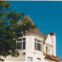 A large three story mansion, originally the home of I.A. Macrum. It was the Forest Grove Hospital from 1911 until 1918. The home later became Castle School, a kindergarten and later back to a residence. The home is on the National Register of Historic Places and is located on Cedar Street at 12th Avenue. This picture was taken from the street corner of Cedar Street and 12th Avenue showing a close up view of the front and south side if the tower.