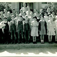Black and white image of a group of students gathered in front of Gaston school. These students all lived in Yamhill County according to school district records, but their school was in Washington County. Of the forty-four students listed on the school record, twenty have Japanese names.