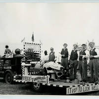 Several men pose on a parade float for Wess' Tonsorial Shop in Hillsboro. Four of them are part of a barbershop quartet, a young boy serves as the barbershop customer, and two other men act as the barber and shoe shine man. Their float is pulled by a truck that says 'House of Antiques Hillsboro' on the side.