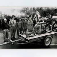 Several men stand around a parade float, which has a dummy labeled as a 'Boozy Old Bum?' Some of the men are in uniform, so these men may have been part of a group such as the American Legion or Veterans of Foreign Wars.