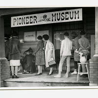 Photograph of several people standing on the front porch of the Pioneer Museum, which is now the Washington County Museum. This photo was taken when the museum was located in the Heidel House in Downtown Hillsboro.