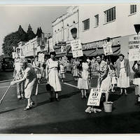 A group of women walk down the street in Downtown Hillsboro, campaigning for Dwight Eisenhower's first presidential election in 1953. Many of them carry mops and brooms, and their signs proclaim various slogans, including 'Vote For Eisenhower for a Sweeping Victory,' 'Lower Taxes Stop Inflation,' 'A Clean Sweep with Eisenhower and Nixon,' and 'Let's Clean House with Ike and Dick.'