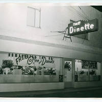 Exterior photograph of the grand opening of The Dinette in Hillsboro. Several patrons are visible through the windows. On the windows are signs advertising 'Hamburgers to go,' 'Free Coffee and Donuts,' 'Fish and Chip's,' and 'Now Open.'