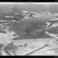 Black and white aerial view looking up Scoggins Dam and Hagg Lake. See WCMpic_013116 for a 'before' shot of the valley before it was flooded by the reservoir.