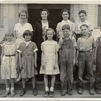 Black and white image of ten students standing outside of their school. Founded in 1856, Jacktown school was located south of Hillsboro. In 1910, the district built a new one-room school at the intersection of Farmington and Jacktown Roads. During the war years of the 1940s, it became increasingly difficult to maintain and staff these small, one-room schools, and many districts consolidated with each other. Jacktown's last school was razed after 1949, when the district merged with several others to form what is now Groner Consolidated Elementary. This image was taken in the mid-1930s, and the teacher is identified in museum records as Miss Evelyn Hesse. She is possibly the woman standing in the back row, second from the right. See WCMpic_013087 and WCMpic_013088 for other images of Jacktown School. Though museum records show these three images as all taken on the same date, 1936-10-05, it is more likely they represent three different school years, and the two smaller groups could represent a single class or grade level.