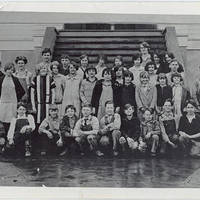 Students gathered at the base of a stairway leading to the front entrance of a building, probably a school. This photograph was likely taken between 1924-1933, based on the hair and clothing styles present. The students probably belonged to a school in Washington County, Oregon.
